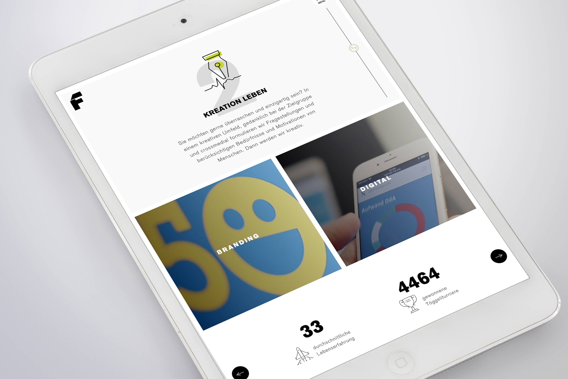 The agency Frontal, where I work since nearly 3 years, trusted me to create our website new. I felt very honored, as the website is the signboard of the company and distinctive for the Corporate Design. The head note of the company acts as navigation on the front page. In order to give the user a personal insight into our firm, a short film was made of each employee while working. The references were configured in an unconventional pattern, which enabled many options – never disregarding Mobile first.